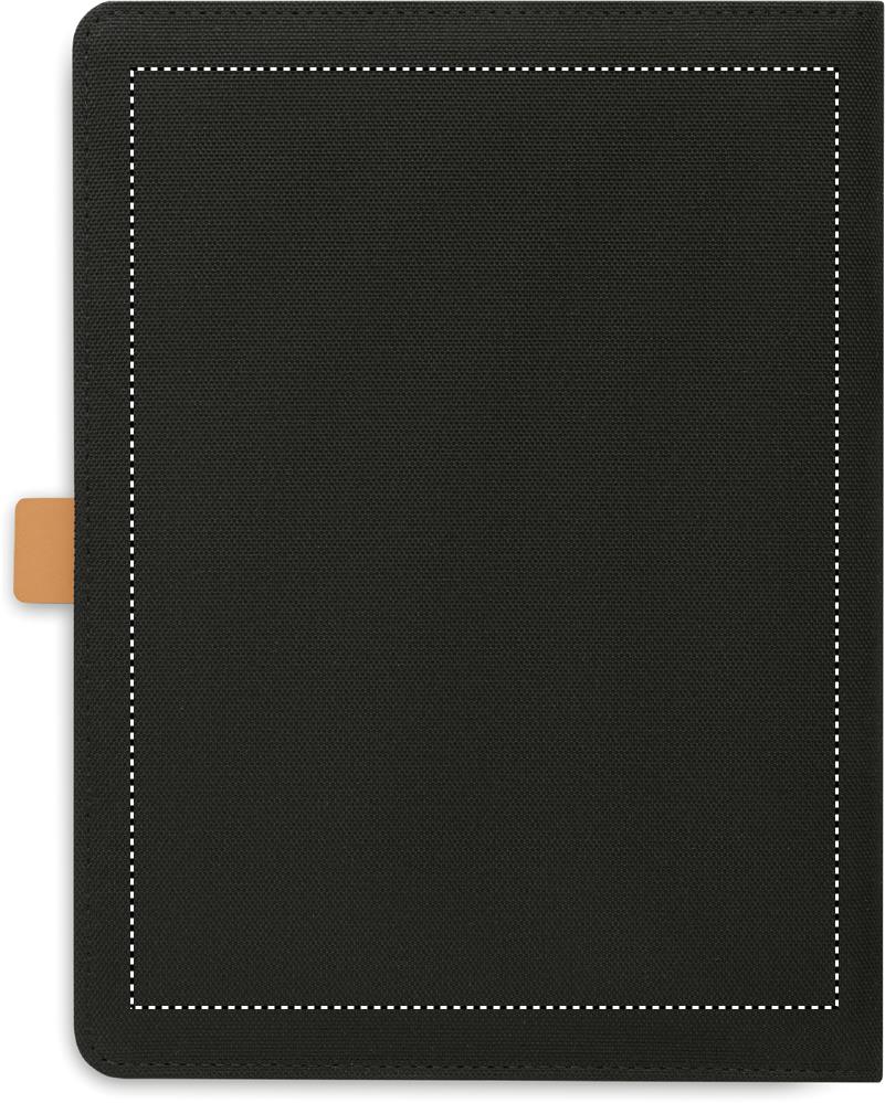 DIN A5 Mappe aus RPET mit Details aus Kunstleder. Auswechselbares A5-Notizbuch mit gebundenem Hard Cover. 64 Blatt (128 Seiten) liniertes Recyclingpapier. Stifthalter, 2 Kartenfächer und ein großes Fach. Elastisches Verschlussband mit Dekor aus Metall.