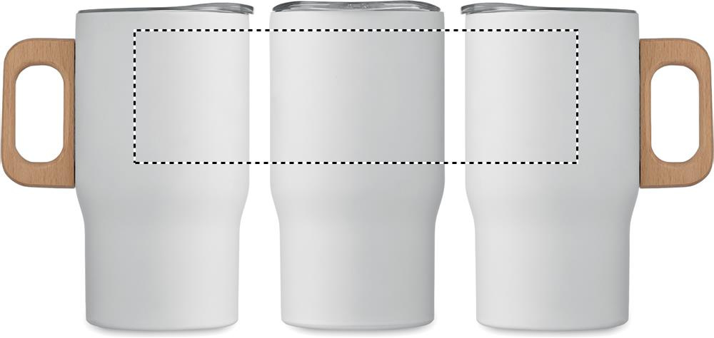 Doppelwandiger Becher aus recyceltem Edelstahl (90 % recycelter Edelstahl und 10 % Edelstahl). Griff aus Holz. Schiebedeckel mit Trinköffnung. Füllmenge: 350 ml.