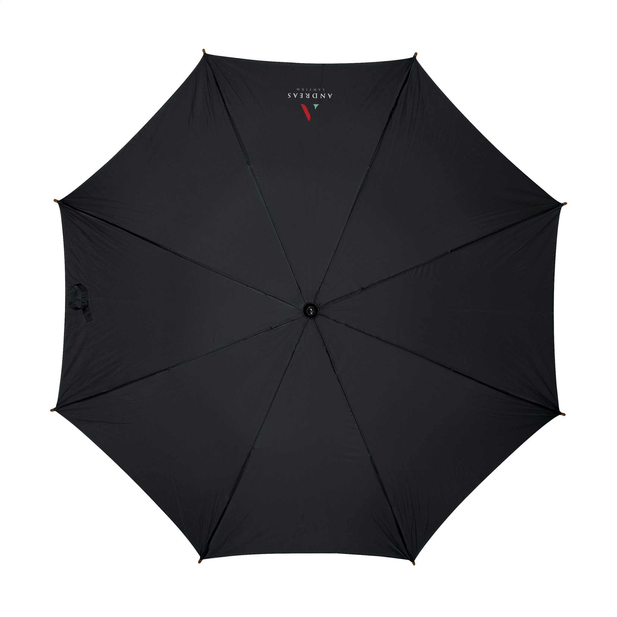 Regenschirm mit automatischer Teleskopöffnung, 190T Polyester-Bespannung, Metallrahmen, Holzstock und -griff und Klettverschluss.