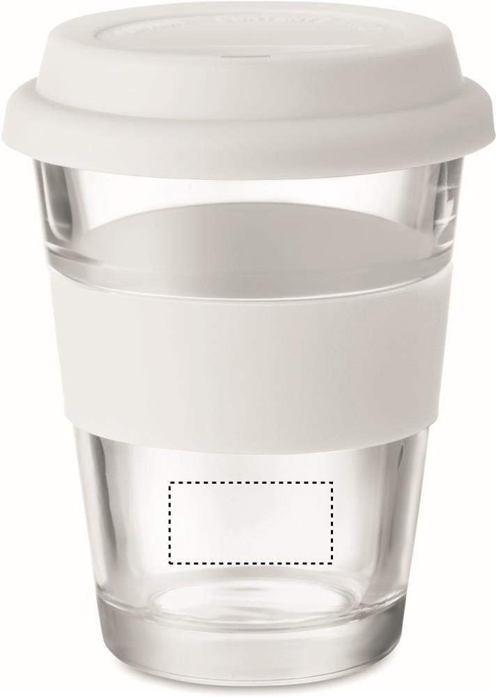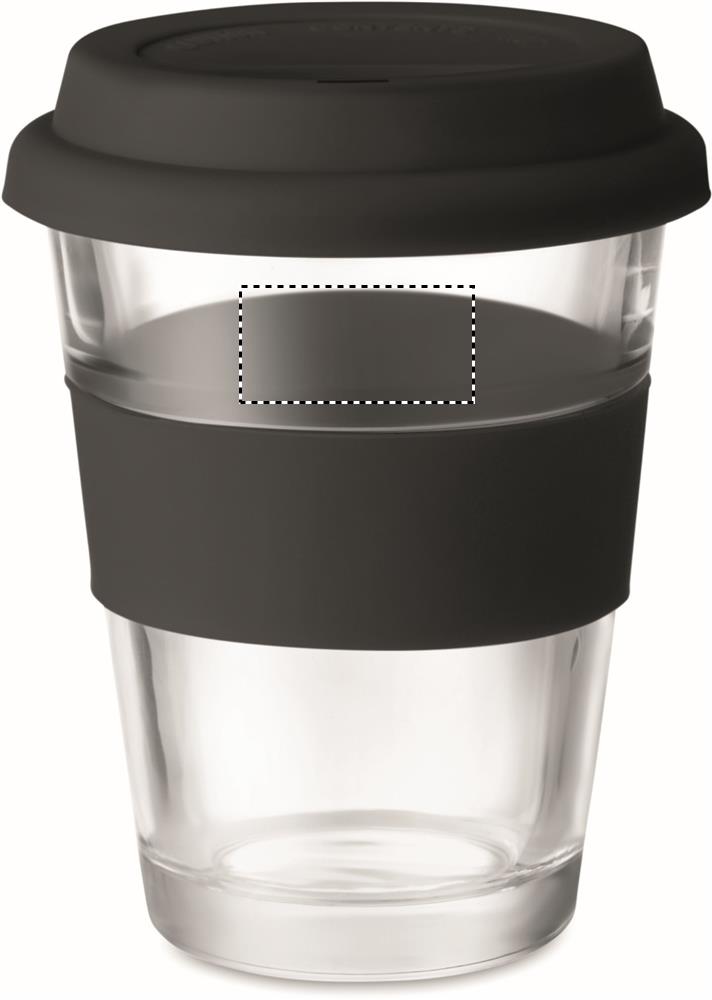 Trinkbecher aus Glas mit Silikon-Deckel und -Griff. Füllmenge: 350 ml. Da der einwandige Becher die Hitze nach außen leiten kann, kann der Artikel heiß werden.