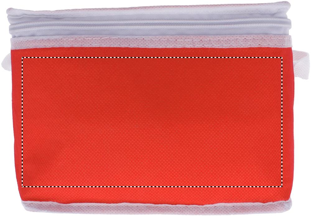 Kühltasche mit isolierender Aluminium-Folie für 6 Dosen. Außenseiten Non Woven mit weißen Absetzungen. 80 g/m². Isoliermaterial: Mit Aluminiumfolie laminierter Schaumstoff. Füllmenge 3L.