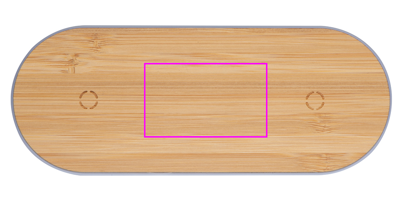 Schlanke Ladestation aus Kunststoff mit Bambusoberfläche und zwei Induktionsladepunkten für Smartphones, inklusive Ladekabel. Ihre Werbung wird auf der Station eingraviert.