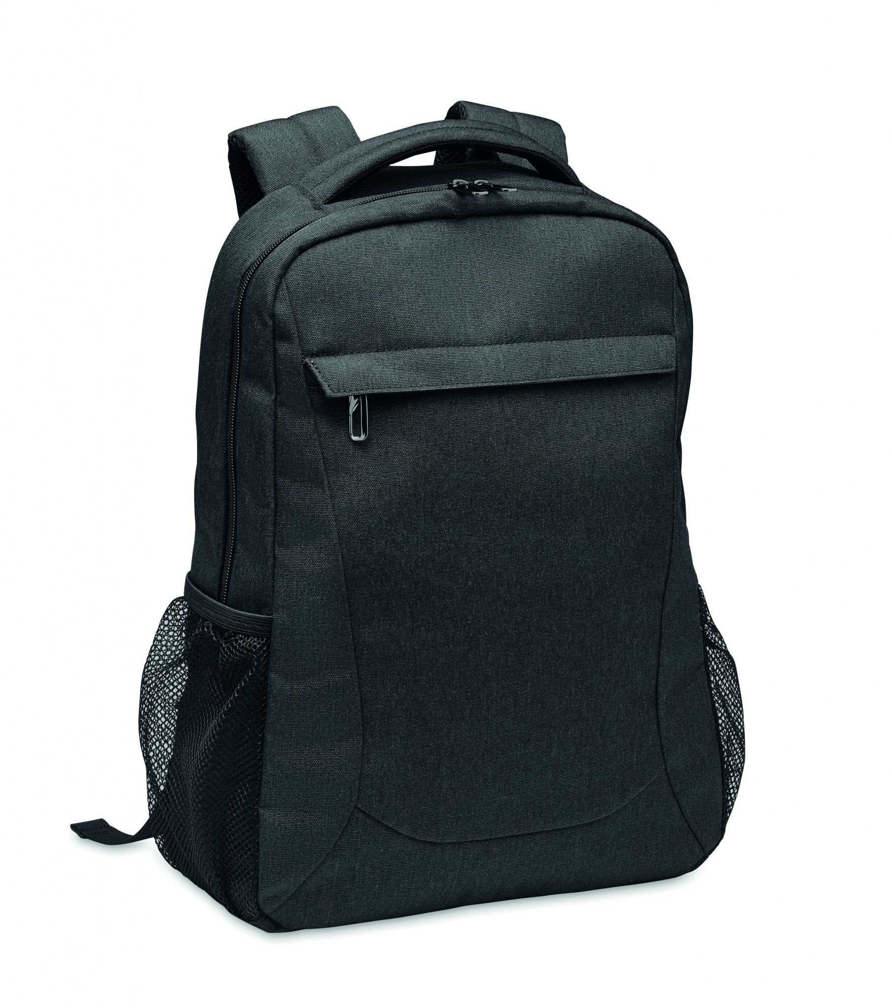 15'' Laptop-Rucksack aus 600D RPET Polyester. Internes Laptopfach und mehrere kleine Innenfächer. Fronttasche mit Reißverschluss und 2 seitliche Netztaschen. Verstellbare Schultergurte. Trolley-Halterung.