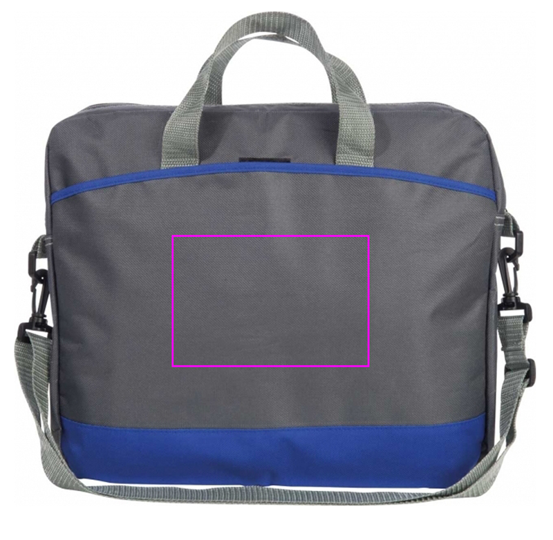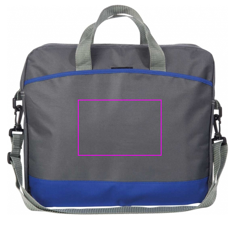 Graue Laptoptasche mit leuchtenden Farbakzenten, geräumigem Innenfach und Frontfach, auf das wir Ihr Logo drucken.