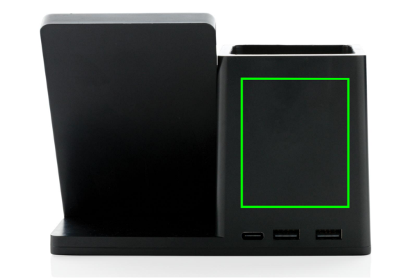 Kabelloses 10W-Schnellladegerät mit Stiftehalter aus RCS (Recycled Claim Standard)-zertifiziert recyceltem ABS. Gesamter Recyclinganteil: 78% basierend auf dem Gesamtgewicht des Artikels. Die RCS-Zertifizierung gewährleistet eine vollständig zertifizierte Lieferkette der recycelten Materialien. Der kabellose Ladebereich besteht aus FSC 100 Bambus. Mit zwei USB-Anschlüssen auf der Rückseite zum Aufladen per Kabel. Kabelloses Laden ist kompatibel mit Android der neuesten Generation, iPhone 8 und höher. Artikel und Zubehör PVC-frei. Inklusive 120cm Type-C Ladekabel aus RCS-zertifiziertem Recycling-TPE. Verpackt in FSC-Mix-Kraftkarton. Type-C Input: 5V/2A; 9V/2A; Wireless Output: 5V/1A;9V/1,1A; (10 W).
