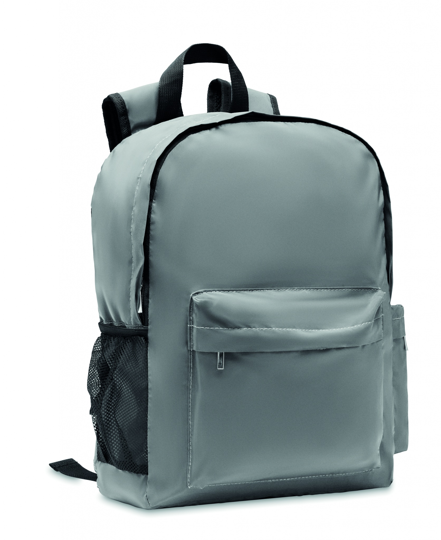 Rucksack aus reflektierendem 190T Polyester. Gepolstertes 15'' Laptopfach. Fronttasche, seitliche Tasche mit Reißverschluss sowie Netztasche. Gepolsterter Rücken aus recyceltem 600D Polyester.