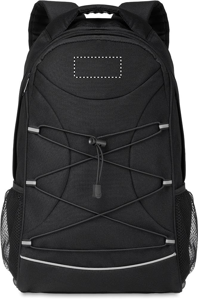 Rucksack aus 600D RPET mit Schnürung auf der Vorderseite und reflektierenden Details. Netztaschen auf beiden Seiten.