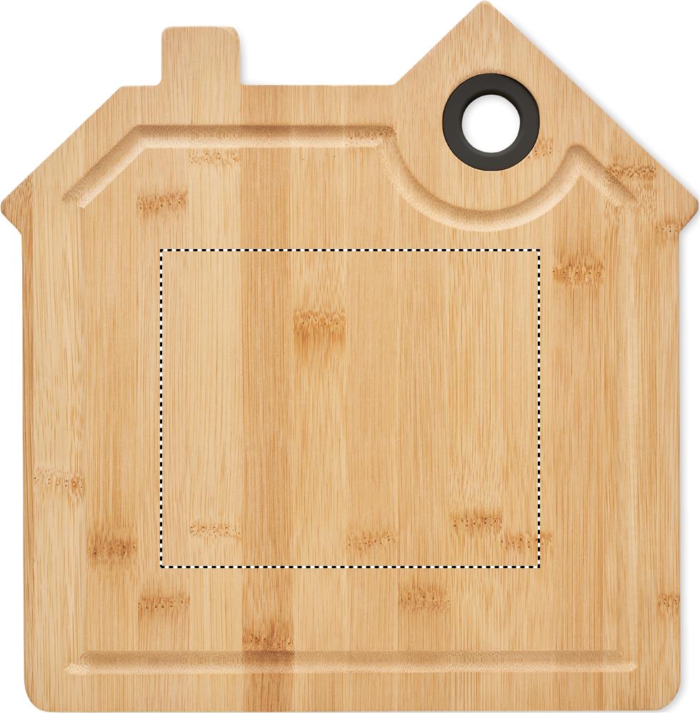 Schneidebrett aus Bambus mit Saftrille. In Optik eines Hauses. Inkl. Aussparung zum praktischen Aufhängen. Bambus ist ein natürliches Produkt, es kann daher zu leichten Abweichungen in Farbe, Dekor und Maßen kommen.
