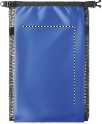 Wasserfester Beutel aus 210D RPET mit Reißverschluss und RPET-Netztasche. Füllmenge: 6 l.