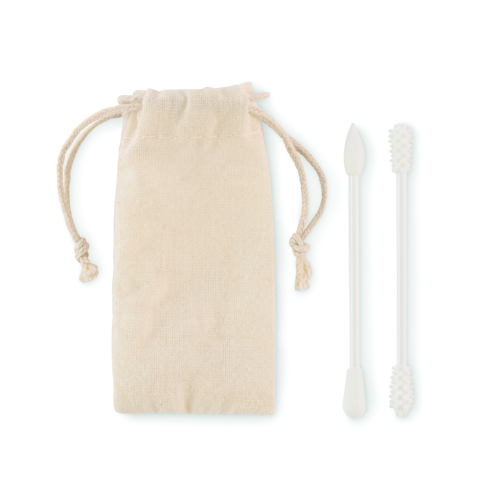 Set mit 2 wiederverwendbaren und abwaschbaren Silikontupfern mit 3 verschiedenen Aufsätzen. Lieferung in einem Baumwollbeutel mit Kordelzug.