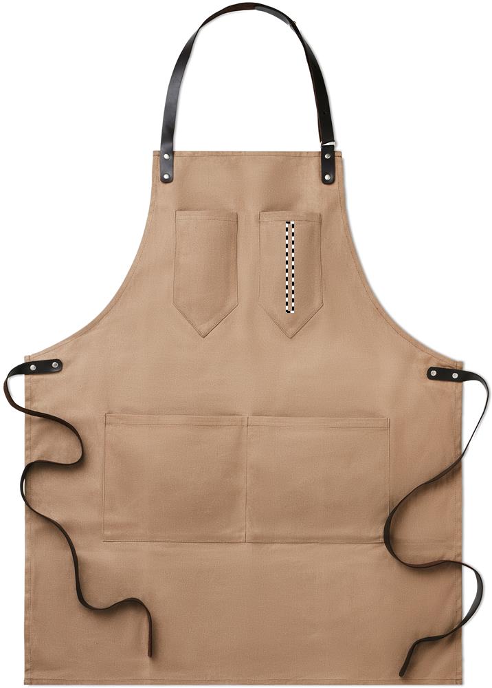Apron in waxed canvas with leather details, adjustable strap with 2 chest pockets and 1 large low level pocket. 12oz Waxed Canvas.