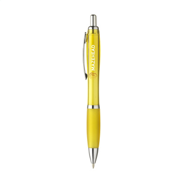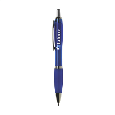 Blue or black ink ballpoint pen with transparant coloured barrel, non-slip grip and metal clip.