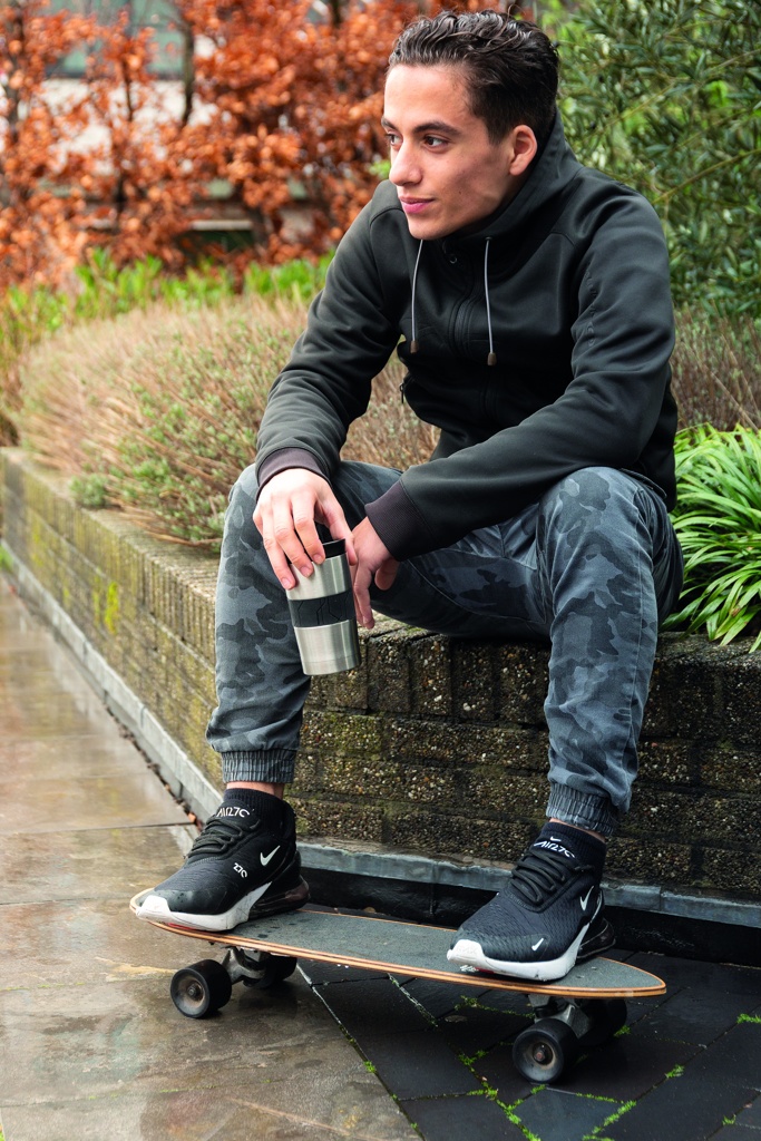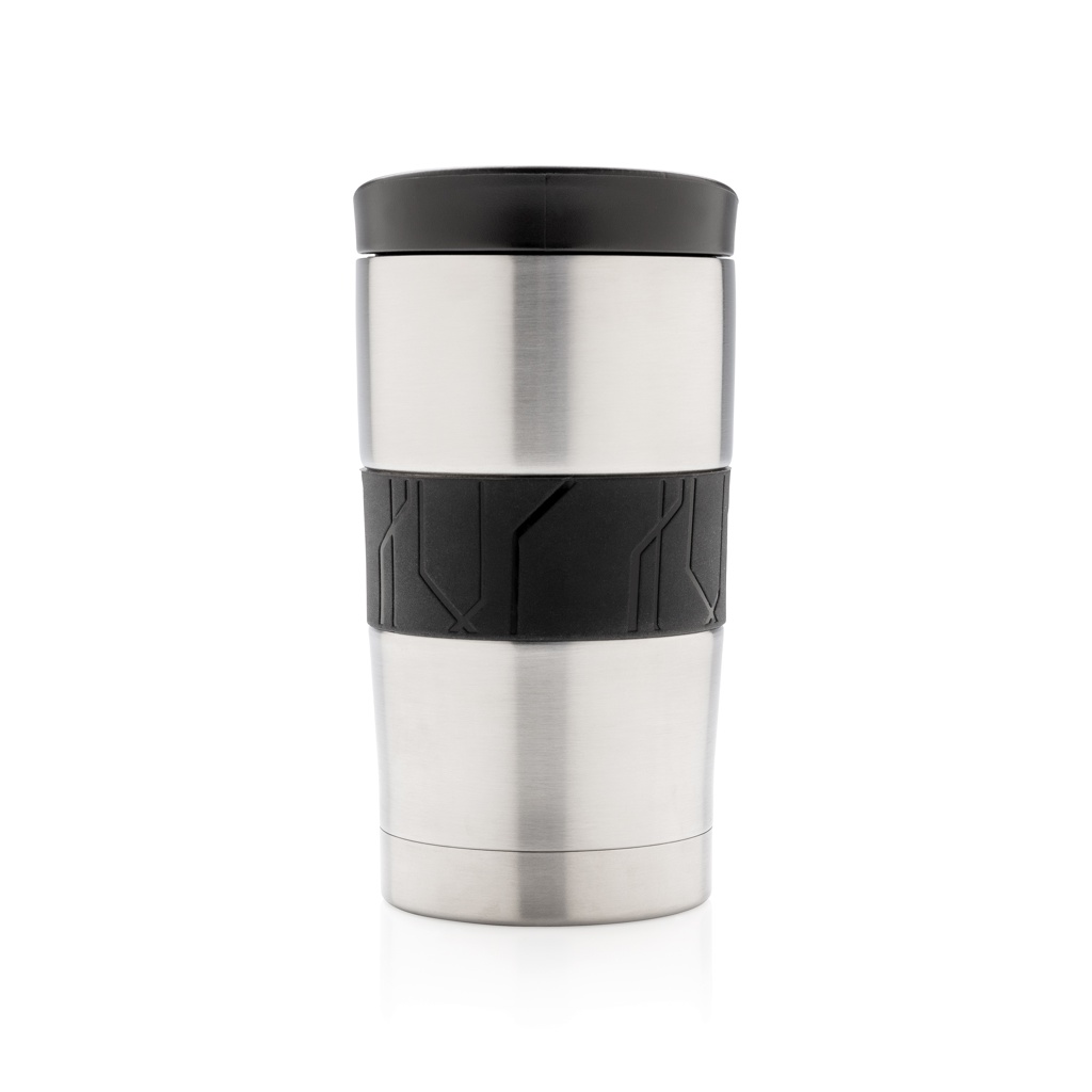 Leakproof vacuum mug made out of 304 stainless steel with silicone grip and slider lid. Dishwasher safe and suitable for most coffee machines. Convenient one-hand drinking. Content: 300ml.