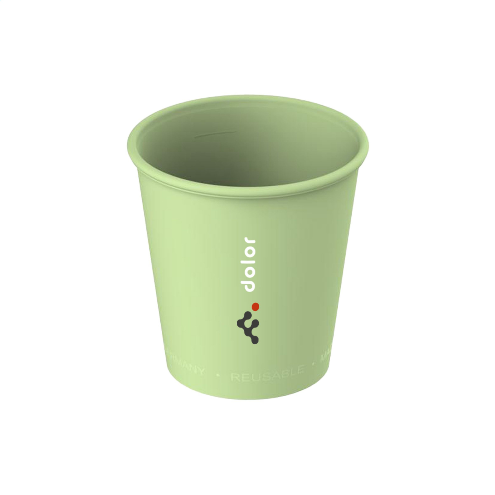 Reusable drinking cup made from plastic. Excellent for use as a standard reusable cup with a coffee machine. The perfect alternative to the disposable coffee cup. By switching to a reusable cup, billions of fewer cups end up in the waste. This beautiful cup is 100% recyclable, BPA-free and stackable. Capacity 200 ml. Made in Germany. Minimum order 100 pieces per colour.