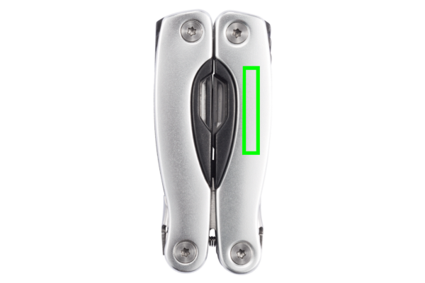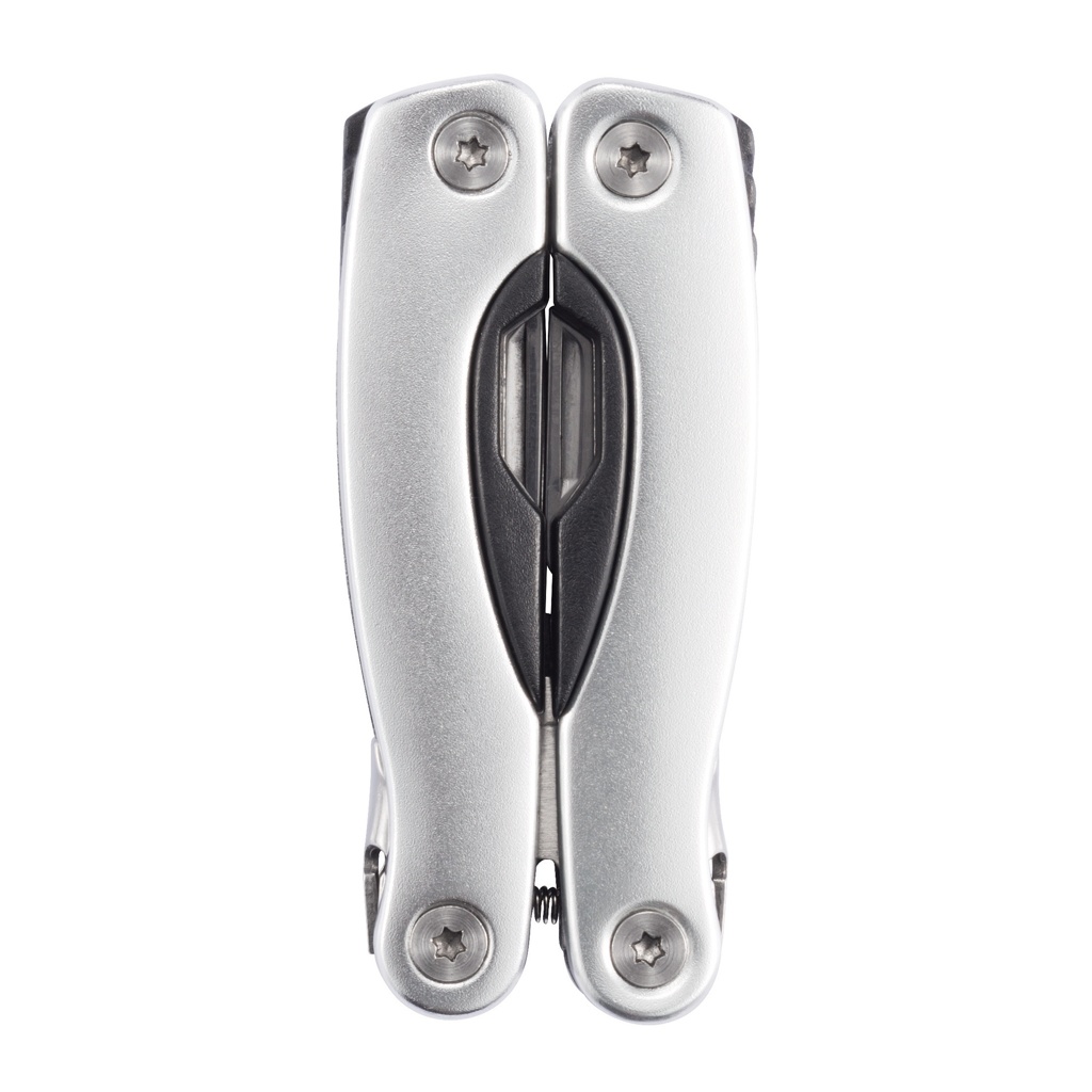 13 functions, stainless steel multitool with aluminium anodised handle. Including black pouch.