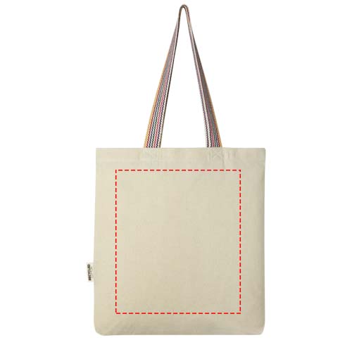 The Rainbow 180 g/m² tote bag is an instant upgrade to the regular cotton tote. Made from pre-consumer recycled cotton, this grocery tote features 25 cm rainbow webbing grab handles, and a 3.5 cm gusset bottom for a bit more storage room. Resistance up to 5 kg weight.