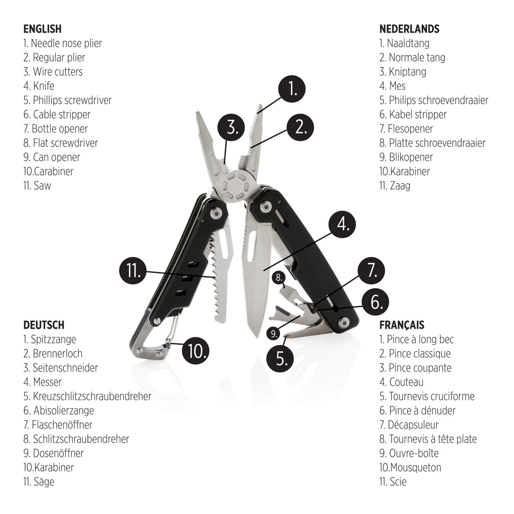 Strong and durable multitool with 11 functions. With aluminium case and stainless steel tools. Tools include: needle nose plier, regular plier, wire cutters, knife, phillips screwdriver, flat screwdriver, saw, can opener, bottle opener, wire stripper, carabiner. Packed in gift box.