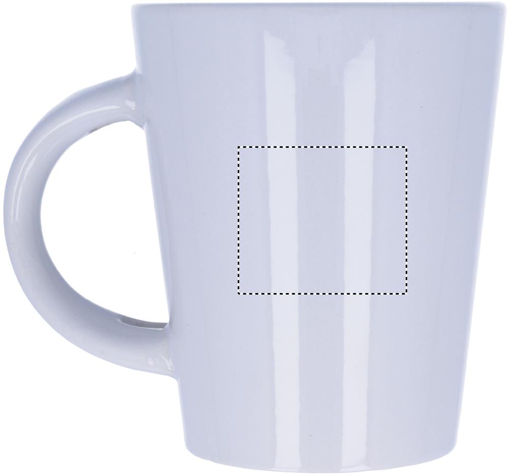 Stoneware mug of 300 ml capacity with special coating for sublimation printing. It has a spoon on handle. Individual packing in white carton box.