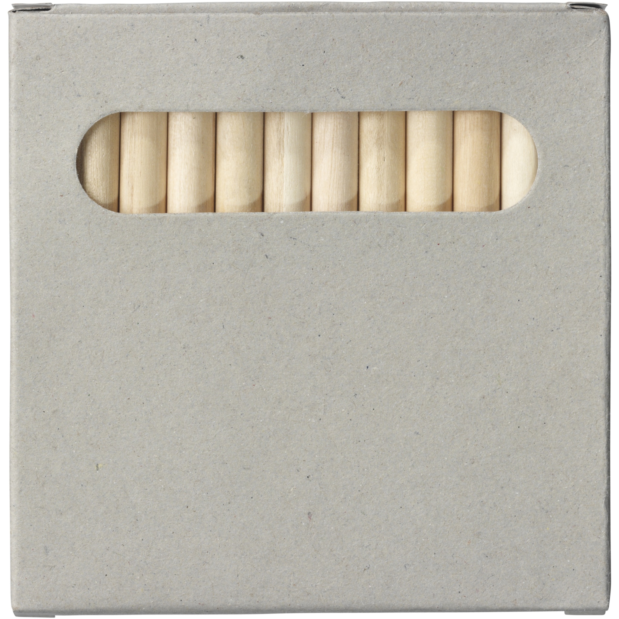 12 coloured pencils inside a paper box.. Decoration not available on components.