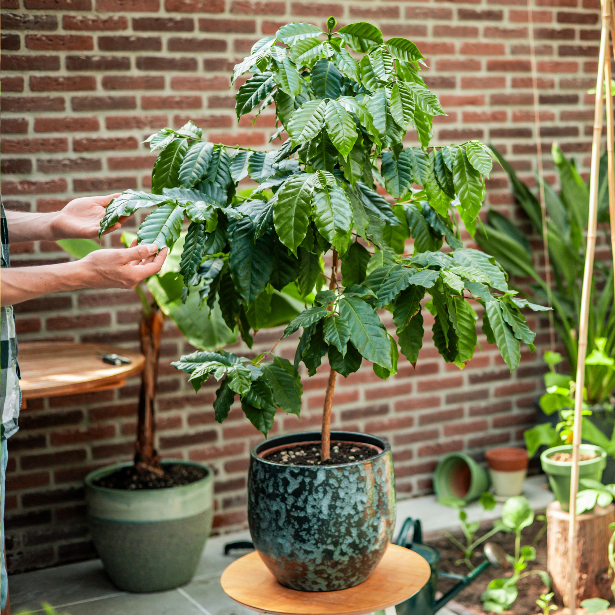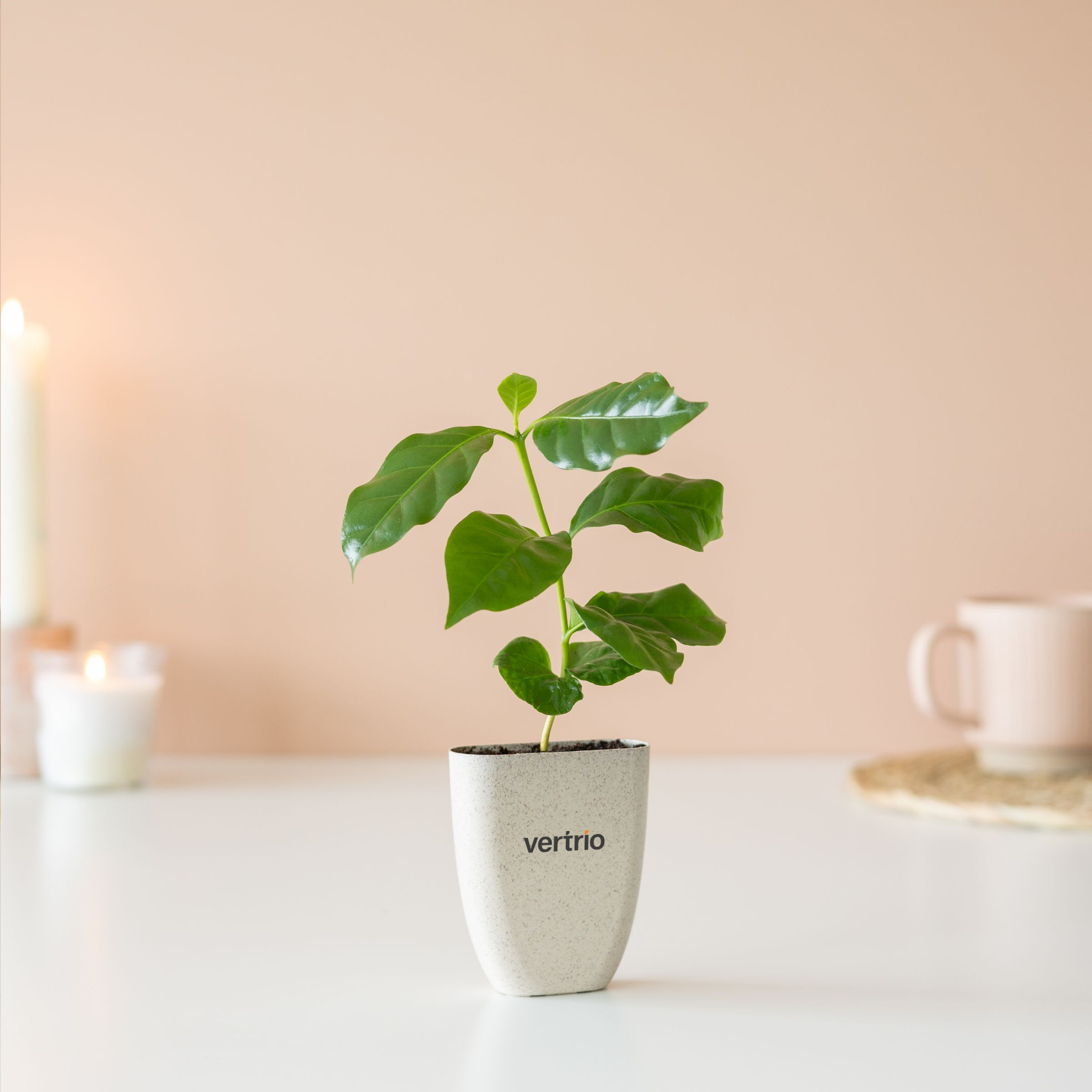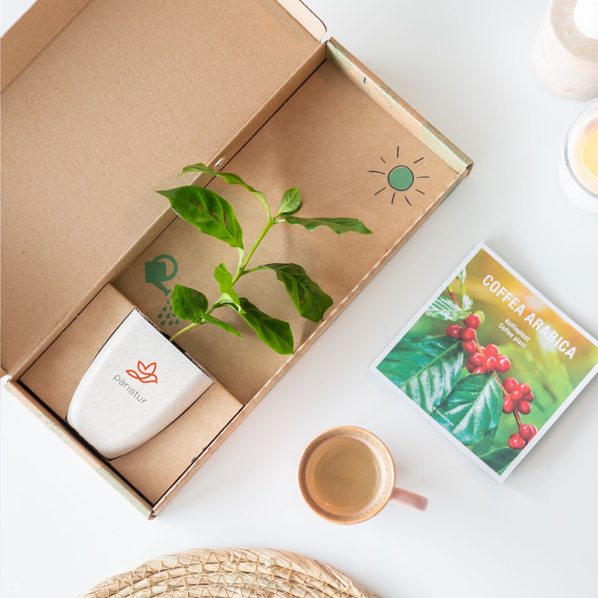 Mailbox tree from the Treemore brand: Coffee tree (Coffea arabica). A product in which the tree takes centre stage, where everyone can take care of their own tree at home, watching it grow. The trees are sourced from an Dutch nurseries and are delivered in a flower pot and packaging that has been specially developed to fit through a letterbox. The tree is supplied in the soil and in a bio-based flower pot made from elephant grass fibres. The packaging and the supplied information booklet are FSC® certified and 100% recyclable. An original way to surprise someone whilst also making the world a little greener.
