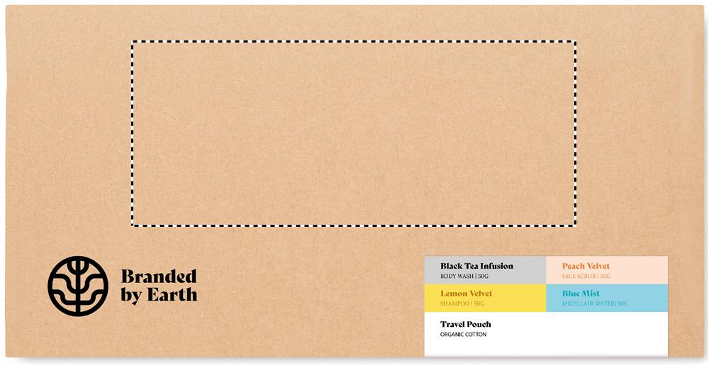 Unisex travel gift set by Branded By Earth. Includes vegan 50gr of body wash, shampoo, face scrub, micellar water bag and a travel pouch in organic cotton. All pieces packed in a can. Presented in recycled paper box. Made in EU.
