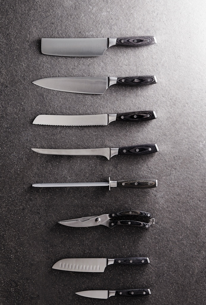 Chef's knife made of X50CrMoV15 German steel with a Pakkawood handle. The easy-grip handle and superb balance in the blade makes the knife comfortable and easy to work with. Size: 20 cm blade.
