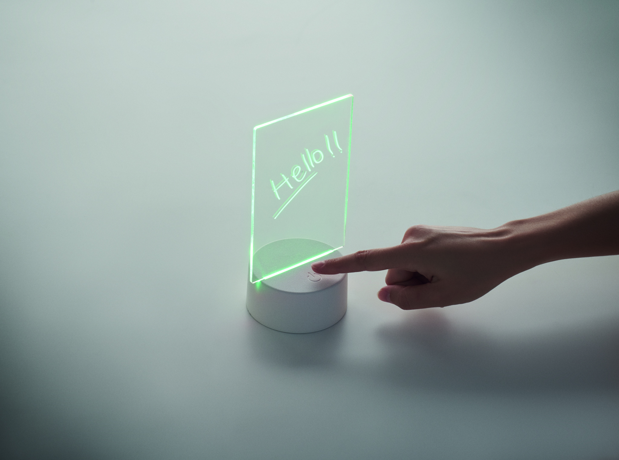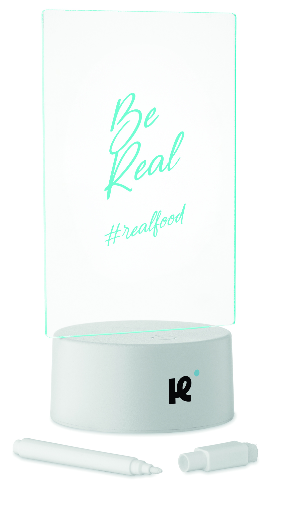Valgustatud LED-märkmetahvel värvimuutva tule ja kustutatava valge markeriga. Akrüülplaadi ja alumiiniumist alusega. Patareitoitel, vajab 3 x AAA patareid (ei kuulu komplekti).