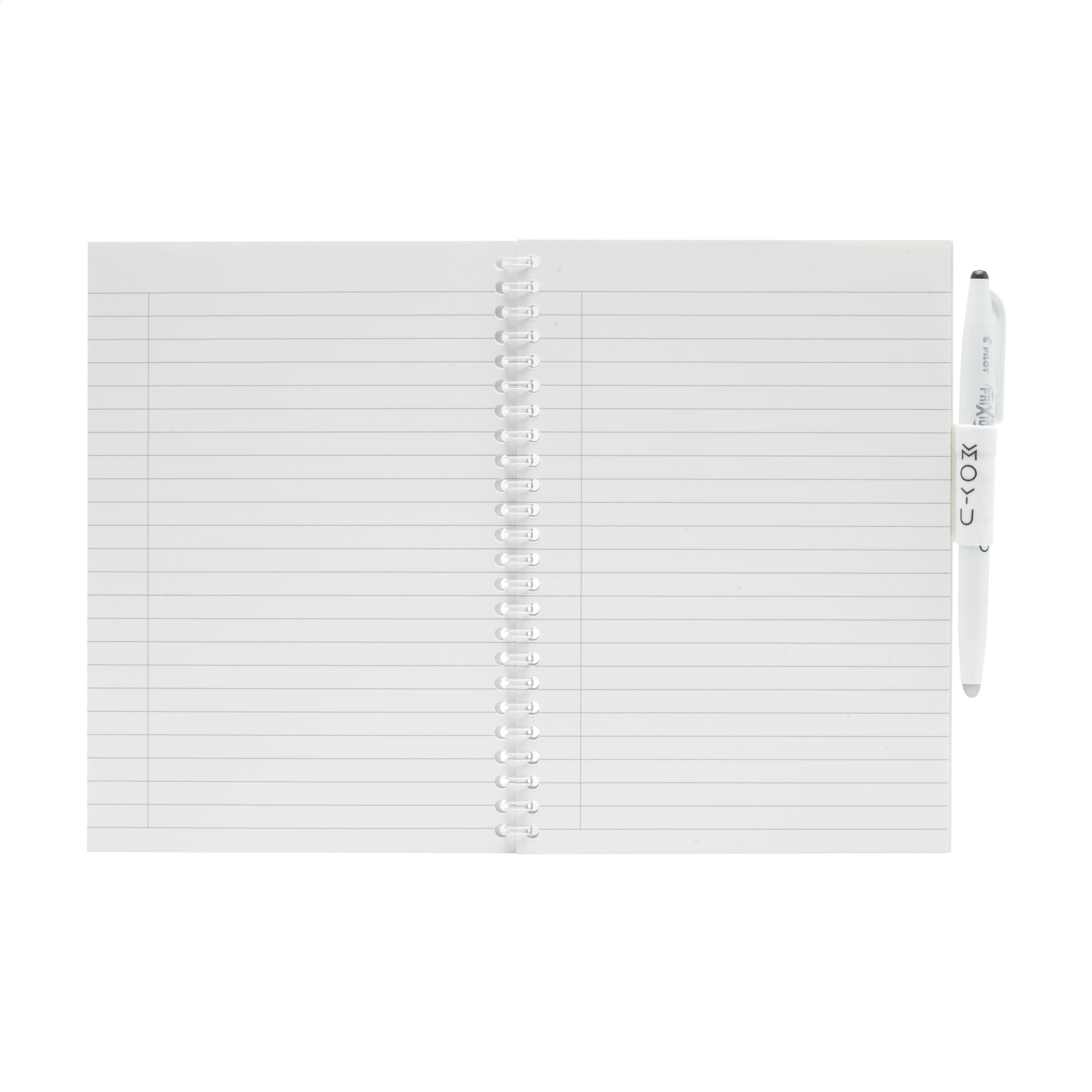 MOYU kaubamärgiga A5 kustutatav kivipaberist märkmik. Painduva 400 gsm pehme kattega. See märkmik sisaldab pliiatsit ja puhastuslappi. Iga kivipaberileht on jätkusuutlikult toodetud, looduslikult puuvaba ja 100% taaskasutatav. See elastse pliiatsiaasaga märkmik on köidetud tugevasse traat-o-köites ja sellel on 18-leheküljeline jooneline paber. Tehke märkmeid kaasasoleva spetsiaalse MOYU pliiatsiga. See pliiats sisaldab originaalset Frixioni tinti. See spetsiaalne tint kuivab täielikult kivipaberil ja seda on lihtne kustutada ilma jälgi jätmata. Niisutage kaasasolevat MOYU lappi veidi veega ja kustutage tint. Nii jäävad leheküljed uute ideede ja ülesannete nimekirjade jaoks tühjaks. Kivipaberile saab kirjutada keskmiselt 500 korda. See märkmik kestab teile aastaid. Kivipaber on valmistatud 80% lubjakivist ja 20% puhtast plastikust. See on loomulikult puudevaba ja selle valmistamiseks pole vaja vett ega kemikaale. Kivipaberi tootmine on seega säästlikum ja toodab 67% vähem CO2 kui paberimassi tootmisel. Lisaks saab kivipaberit lõputult taaskasutada, ilma et oleks vaja lisada uusi tooraineid.