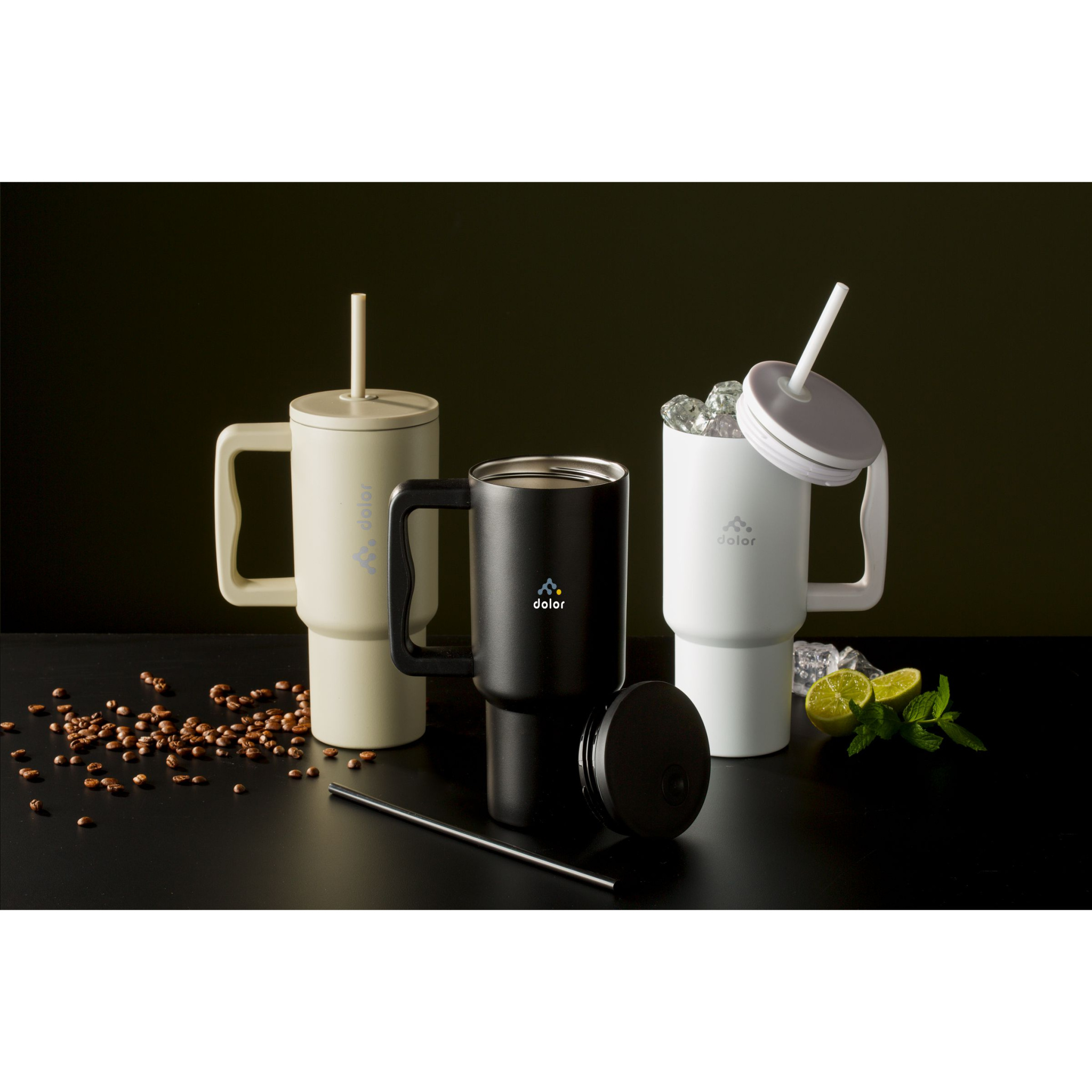 Vau! Taaskasutatud roostevabast terasest valmistatud suur topeltseintega joogitops koos õlgedega. Silmapaistval, tugeval kruusil on suur plastikust käepide ja keeratav kaas, millel on ava kaasasoleva plastikkõrre jaoks. See suur kruus hoiab jooke temperatuuril pikemat aega. Sobib külmade ja kuumade jookide jaoks. Ilma kõrreta ei kao temperatuur tänu kaanes olevale silikoontihendile. See kruus võib minna kõikjale. Ideaalne jõusaali või kontorisse. Tänu koonilisele kitsale põhjale mahub tass peaaegu igasse topsihoidjasse, mistõttu on see ideaalne liikvel olles. Ei ole nõudepesumasinas pestav. RCS-sertifikaadiga. Kokku taaskasutatud materjal: 75%. Mahutavus 900 ml. Iga toode tarnitakse eraldi pruunis pappkarbis.