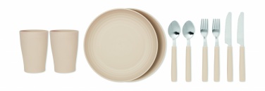 Külmekott või välipiknikuseljakott 2-toonist 600D RPET-ist koos 2 inimese lauatarvikutega. Sellel on roostevabast terasest nuga ning PP-kahvel, lusikas ja tass.
