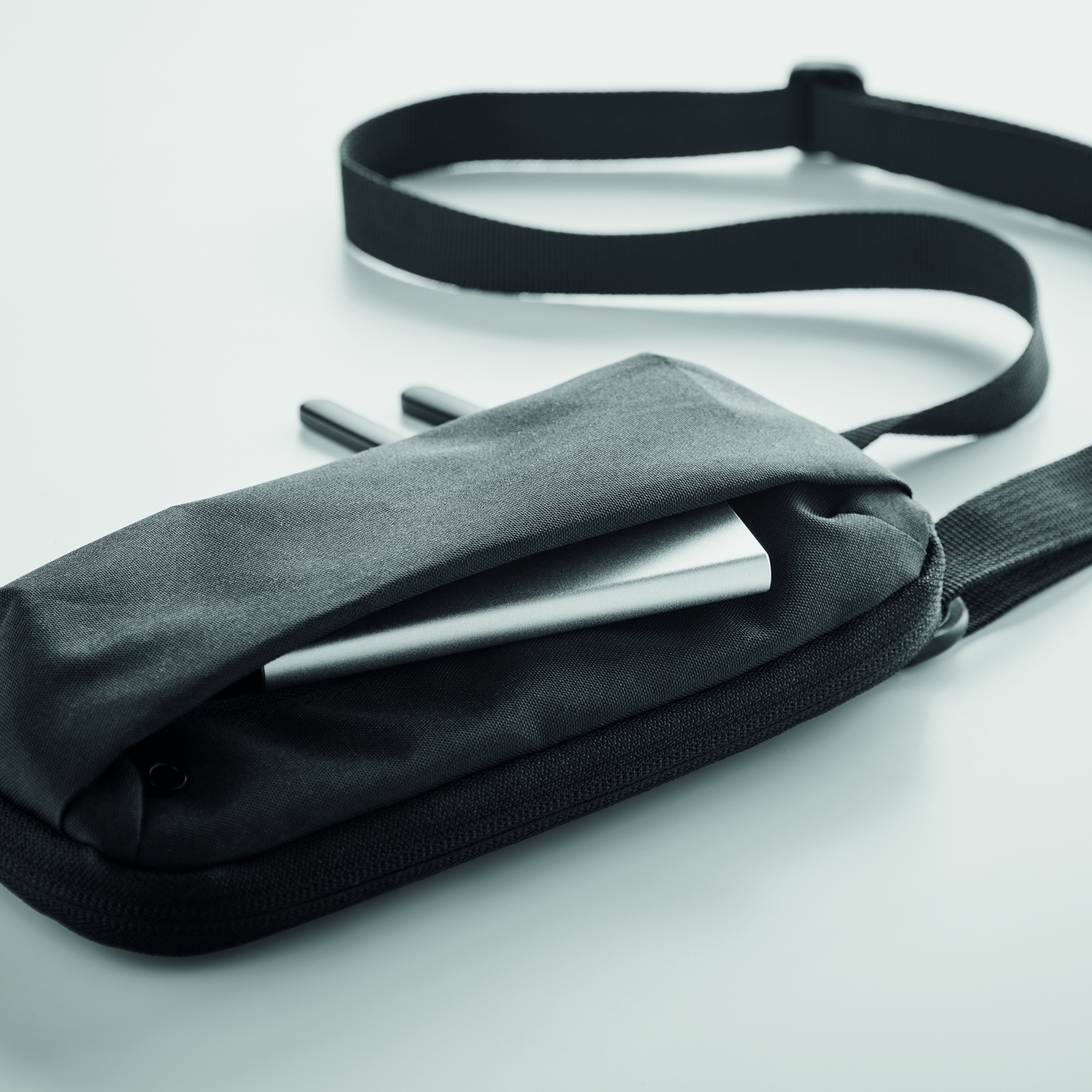 Yliolanlaukku puhelimelle 300D RPET polyesteristä, säädettävällä hihnall. Vetoketjullinen etu- ja sivutasku. sekä useita muita taskuja.