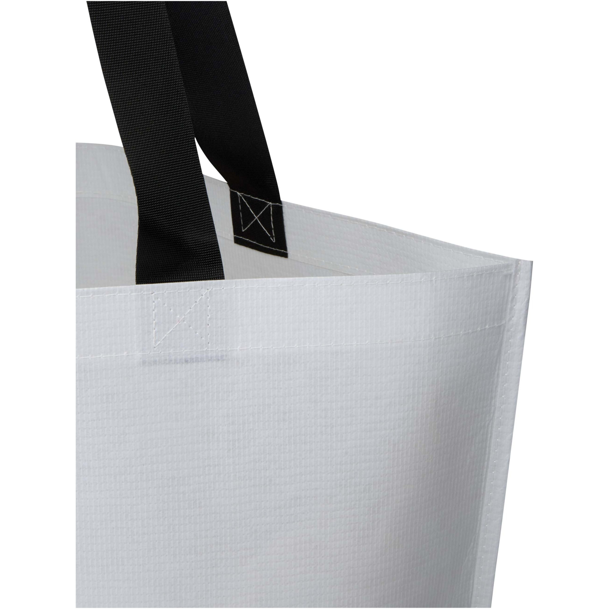 Erittäin suuri Duo-kassi, jossa on kaksinkertaisesti laminoitu pohja. Se on valmistettu 150 g/m2:n GRS-sertifioidusta RPET-materiaalista, ja se on kestävä ja vedenpitävä. Siinä on tilava avoin päälokero, tukevat, vahvistetut kahvat ja leveä pohja lisäkapasiteettia varten. Kantokyky jopa 15 kg. Kassi on tyylikäs ja luotettava vaihtoehto ruokaostoksille, rantaretkille, piknikille tai viikonloppumatkoille. Tilavuus: 30 litraa.