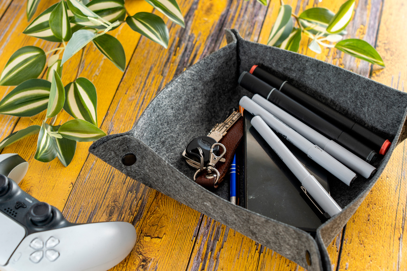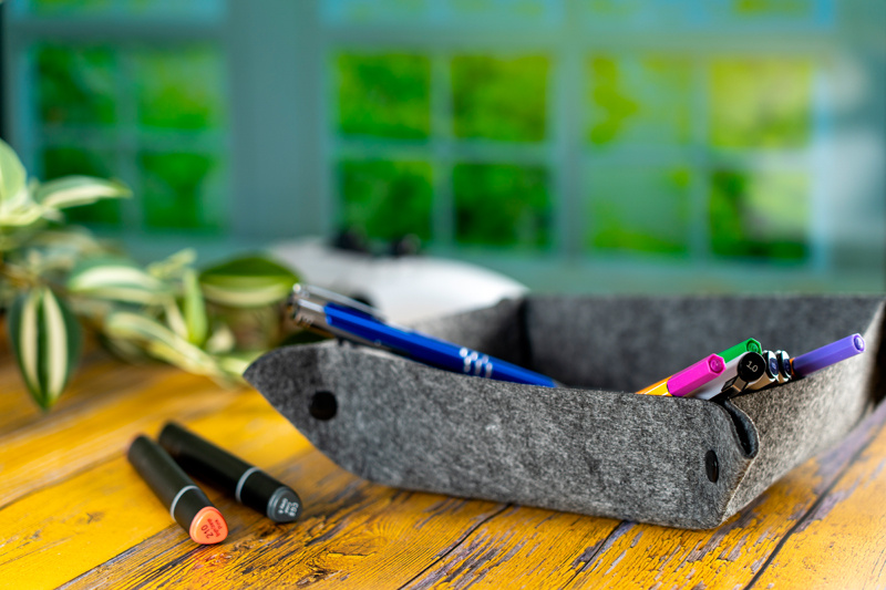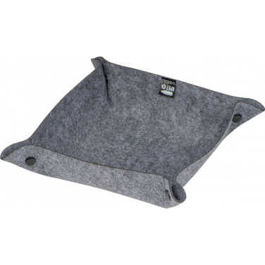 Kierrätetystä huovasta valmistettu säilytyskulho. Käytännöllisten nepparikiinnitysten ansiosta kulho voidaan nopeasti säilyttää tai pystyttää tasaiseksi. Taitetun kulhon mitat 15 x 15 cm.