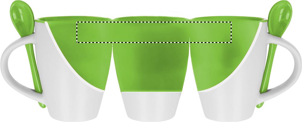 Kaksivärinen keraaminen kahvimuki 250 ml, sisältää lusikan. Tampopainatus kestää vain käsinpesun, keraaminen painatus on konepesun kestävä. Mikroaaltouunin kestävä, yksittäispakattuna 11,5x10,5x9,3cm laatikkoon.
