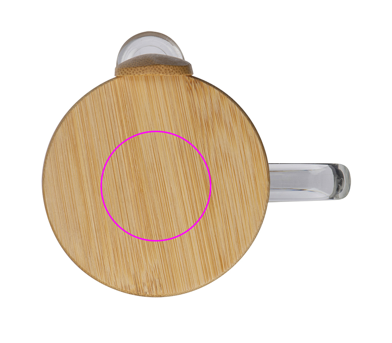 Borosilikaattilasimuki, jossa suljettava bambukansi, integroitu bambulusikka ja tilavuus 420 ml. Logosi kaiverretaan kanteen.