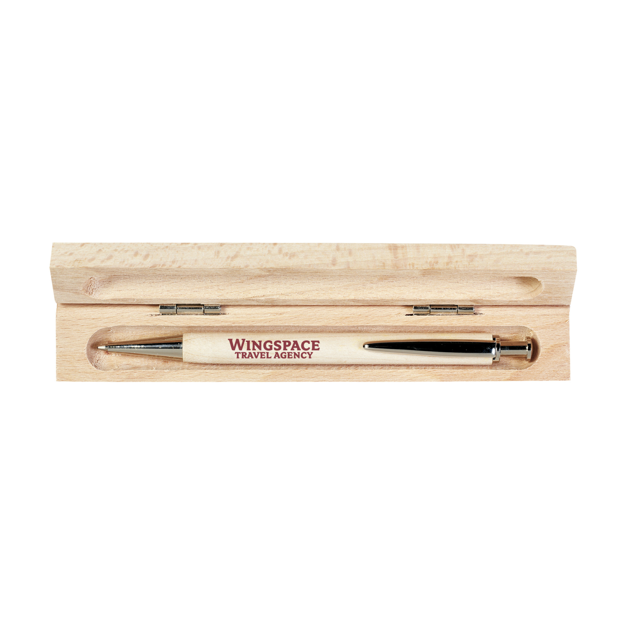 Vau! Sininen muste, pyökkipuinen kuulakärkikynä kromilla kiinnikkeellä, painonapilla ja kärjellä. Pyökkipuisessa kotelossa.