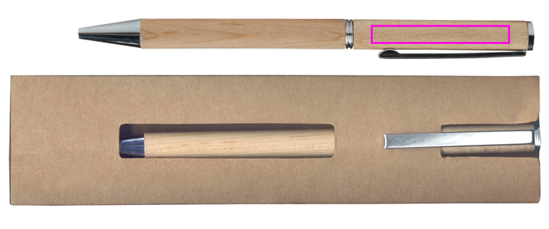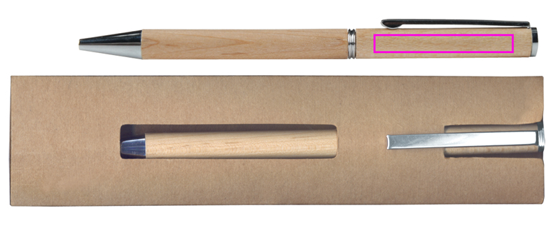 Klassinen puukynä, jossa on sinikirjoitus muovitäyttö ja pahvikotelo. Kaivertamme logosi klipsien alle.