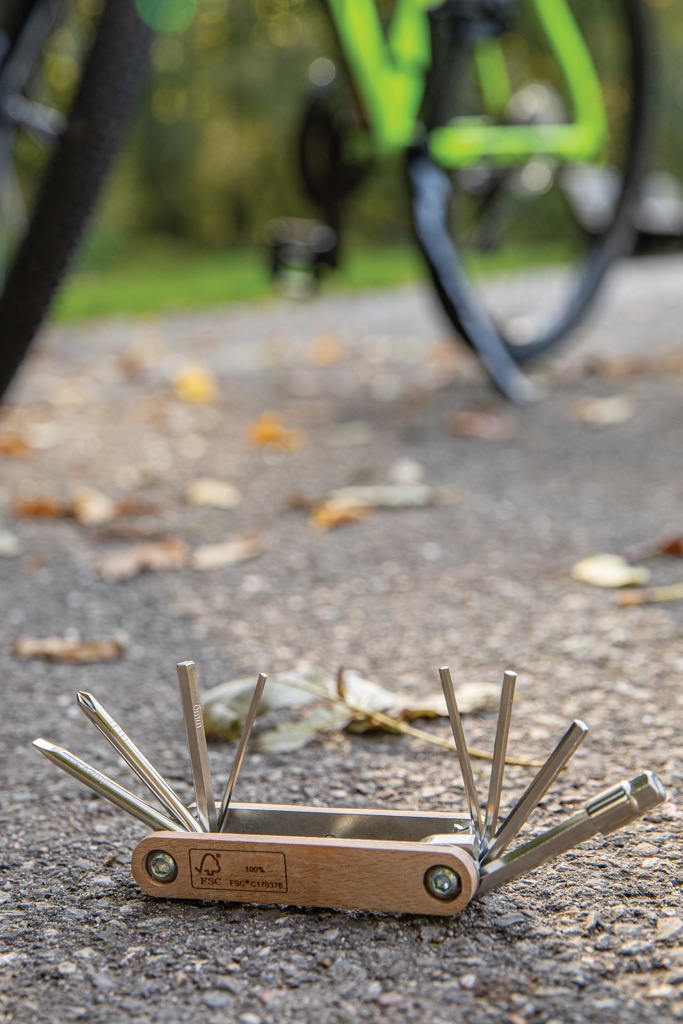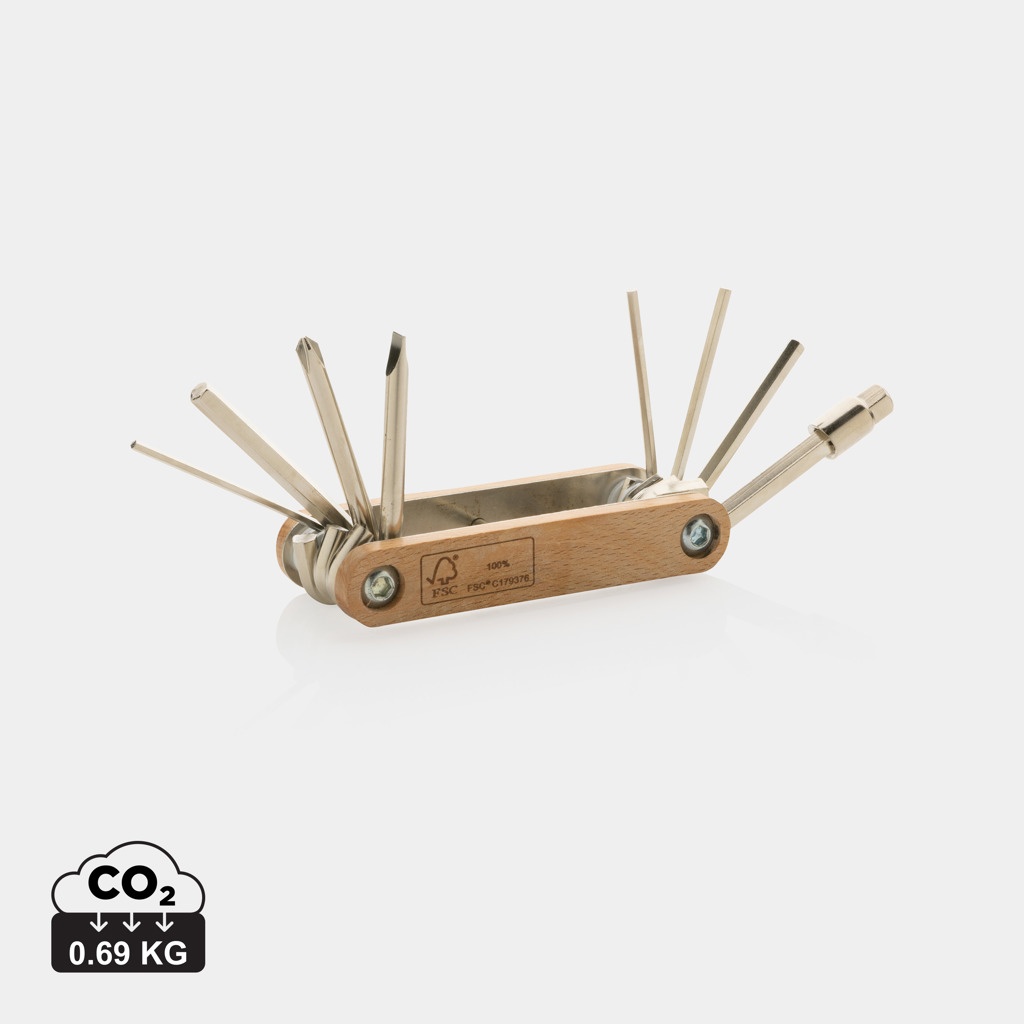 Kuusioavaintyökalu valmistettuna FSC 100% pyökistä ja erittäin kovasta ja korroosionkestävästä hiiliteräksestä (#45). Rockwell kovuus 40-45. Tuotteessa on 9 toimintoa: kuusiokoloavaimet 5.5mm, 2mm, 2.5mm, 3mm, 4mm, 5mm ja 6mm; Philips ruuvimeisseli; litteä ruuvimeisseli. Pakattu FSC-sekoituksesta valmistettuun kraft pakkaukseen.
