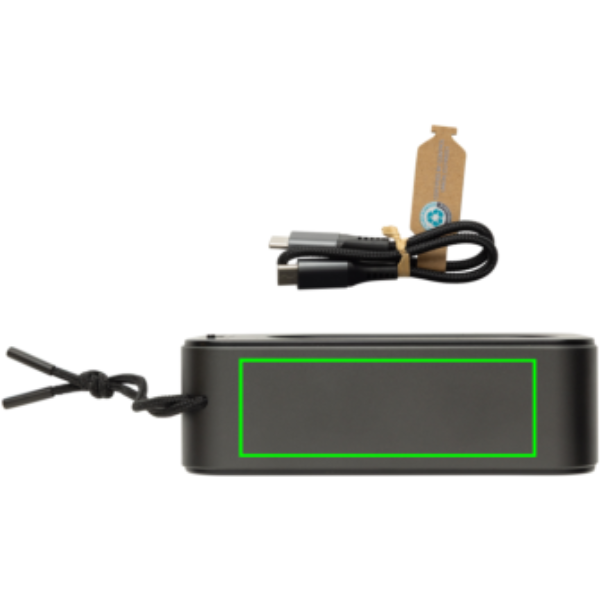 Swiss Peak RCS Recycled Aluminum 10W -kaiutin tarjoaa tehokkaan ja laadukkaan äänen syvällä, kaikuva bassolla integroidun subwooferin ja kahden 5 W:n kaiuttimen ansiosta. Se on suunniteltu poikkeukselliseen äänentoistoon ja siinä on BT 5.3 -yhteys, joka takaa saumattoman yhteyden ja automaattisen pariliitoksen, joten laitteen asennus laitteisiisi on vaivatonta. 1200 mAh:n polymeerili-ioniakun ansiosta kaiutin tarjoaa jopa 5 tuntia toistoaikaa 50 %:n äänenvoimakkuudella ja latautuu täyteen vain 2,5 tunnissa mukana toimitetulla USB-C-USB-C-kaapelilla. Lisäominaisuuksiin kuuluu USB-C-portti ja AUX-portti. Kaiutin on valmistettu RCS-sertifioidusta kierrätysalumiinista. RCS (Recycled Claim Standard) on standardi, joka varmistaa tuotteen kierrätyssisällön koko toimitusketjussa. Kierrätyssisältö yhteensä: 40 % tuotteen kokonaispainosta. Kaiutin ei sisällä PVC:tä ja se on pakattu FSC-sertifioituun lahjapakkaukseen. Kantohihna on valmistettu RPET-materiaalista.