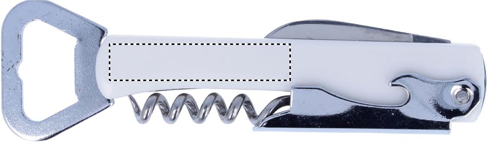 Tarjoilijan veitsi ruostumattomasta teräksestä, korkkiruuvi ja muovinen päällynen.