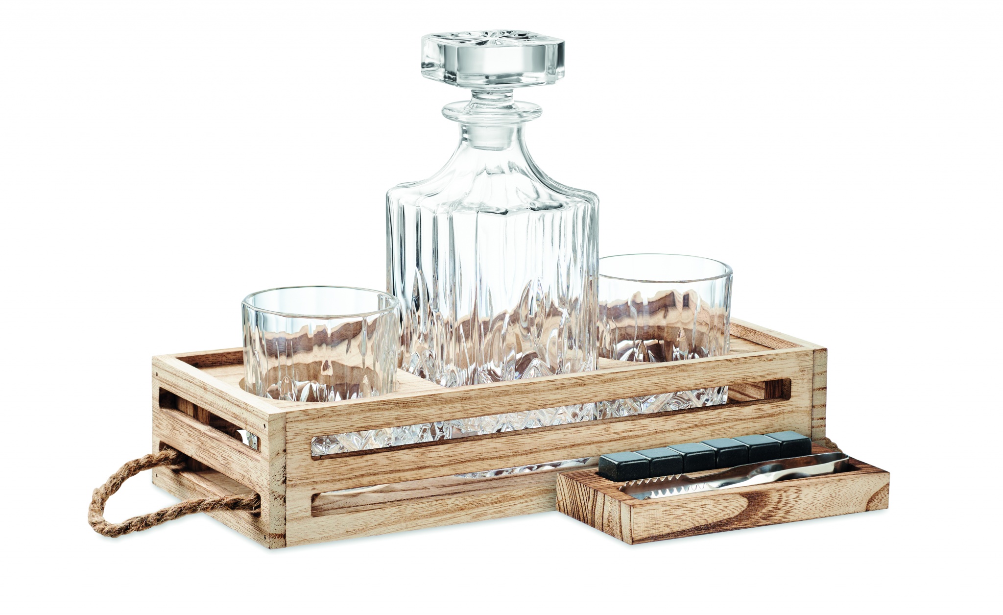Ylellinen viskisetti puisessa sälelaatikossa, sisältää 700 ml dekanterin, 2x 300 ml viskilasia ja 6 uudelleen käytettävää jääpalaa.