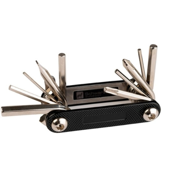 Praktiškų įrankių rinkinys baikeriams. Yra dviračio remonto daugiafunkcis įrankis ir kilpa. Supakuota Schwarzwolf dėžutėje.