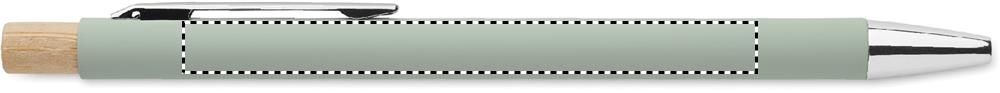Perdirbtas aliuminio stumdomasis rašiklis. Sidabrinis antgalis ir segtukas. Mėlynas rašalas.