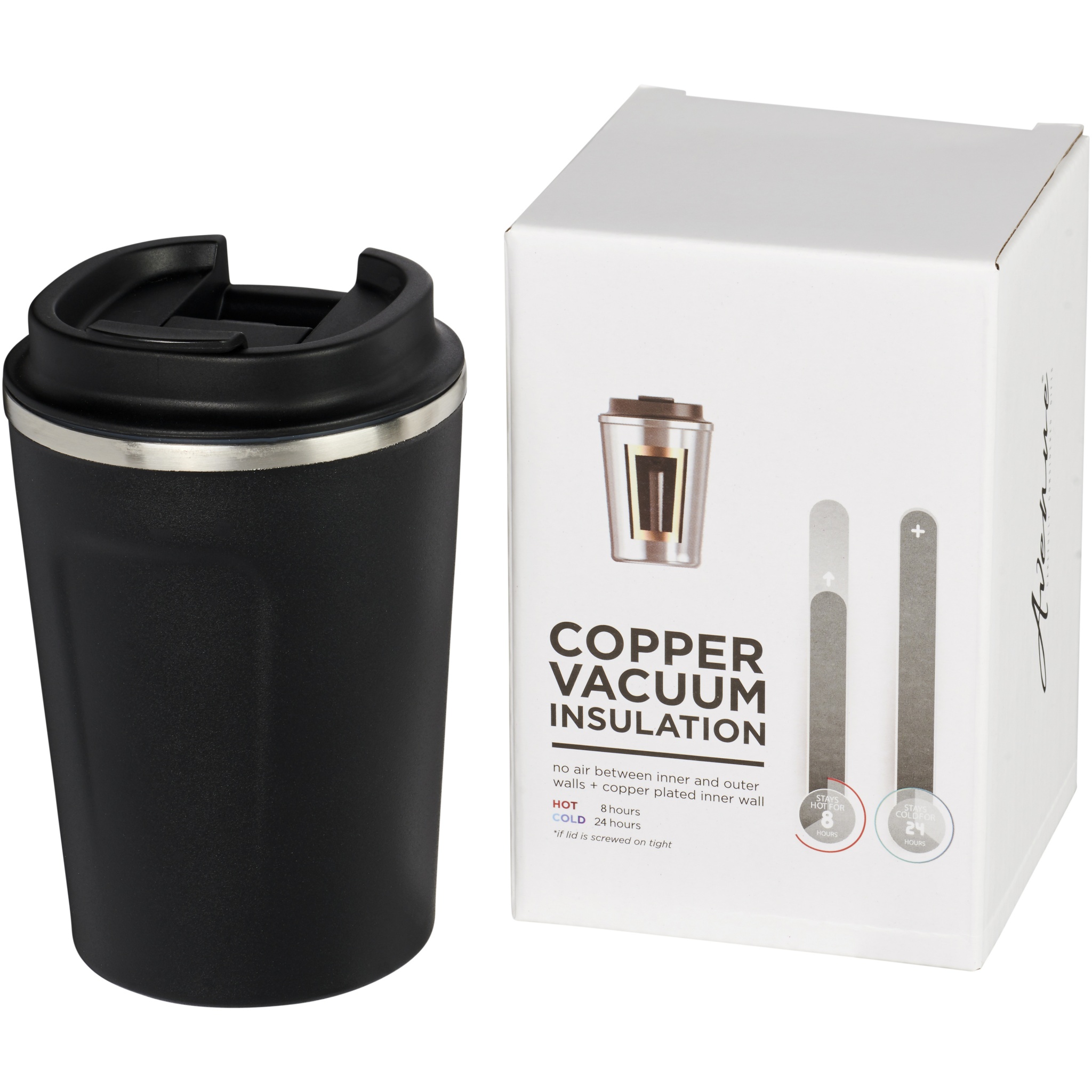 Dubultsienu nerūsējošā tērauda vakuuma konstrukcija ar vara izolāciju, kas ļauj dzērieniem palikt aukstiem 24 stundas vai karstiem vismaz 8 stundas. Konstrukcija arī novērš kondensāta veidošanos tvertnes ārpusē. Uzskrūvējams necaurlaidīgs vāks. Moderns, izturīgs pulvera pārklājums. Tilpums ir 360 ml. Prezentēts Avenue dāvanu kastītē.