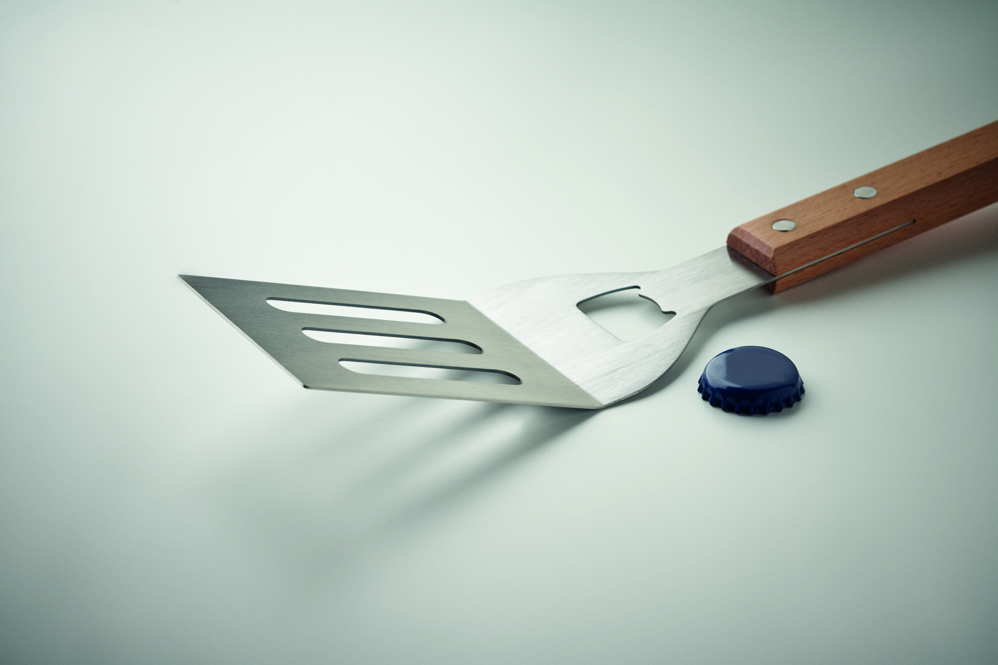 Stainless steel BBQ spatula with beechwood handle and integrated bottle opener. Includes PU rope hanger for easy storage.