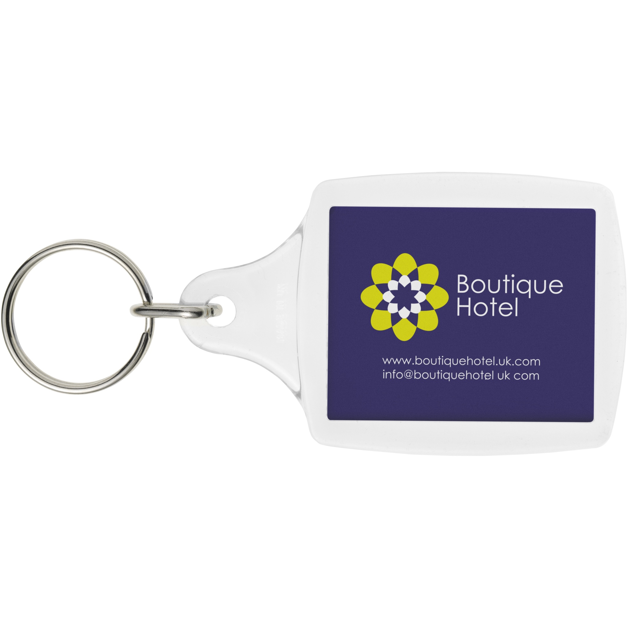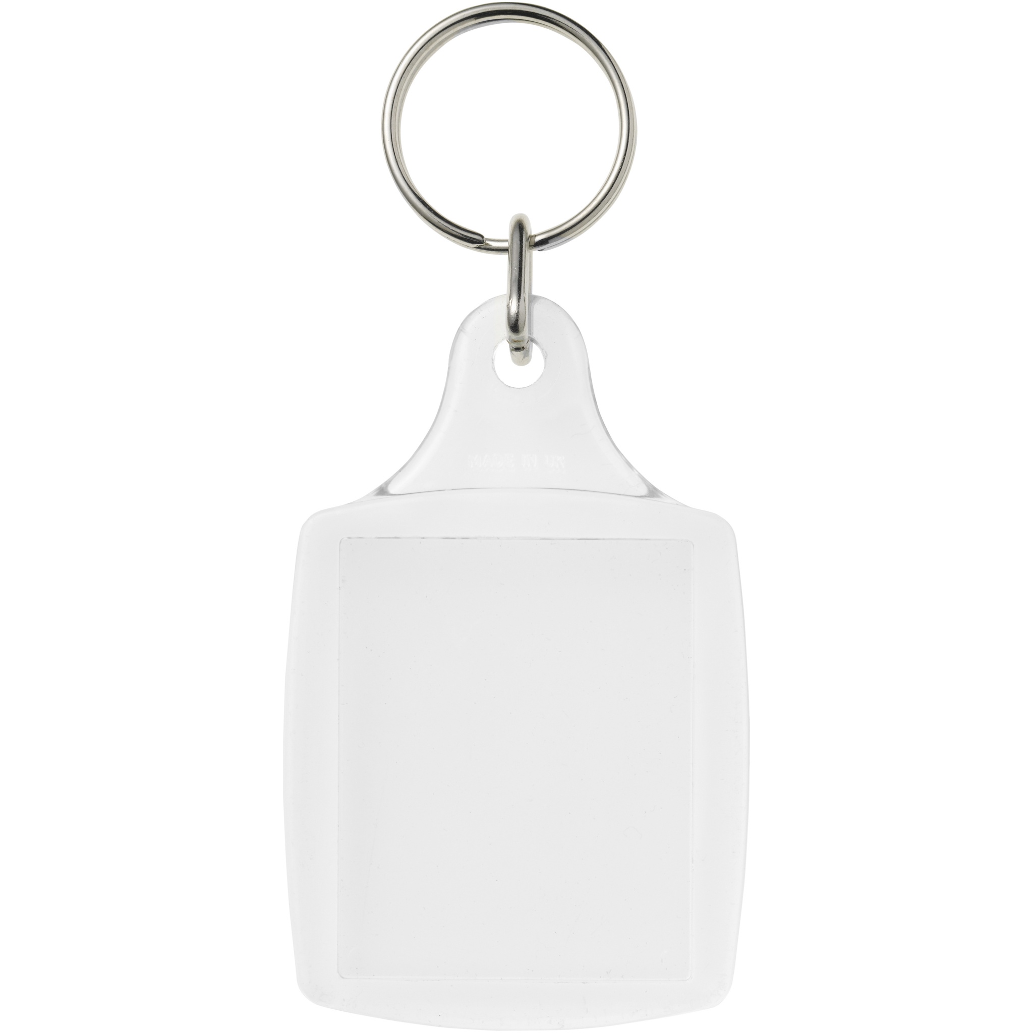 Прозрачный брелок A5 с металлическим разъемным кольцом. Предназначен для транспортировки бумажной вставки или фотографии из паспорта. Размеры печатной вставки: 4,5 см x 3,5 см.