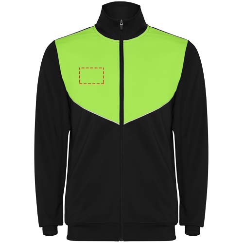 Спортивный костюм из легкой и эластичной ткани. Куртка контрастного цвета с пришивной окантовкой на груди. Высокий воротник с контрастными швами. Центральная молния спереди. Боковые карманы. Манжеты и талия в рубчик 2х2. Брюки с эластичным поясом и кулиской. Контрастная боковая часть с пришивной отделкой. Застежка-молния по краю.
