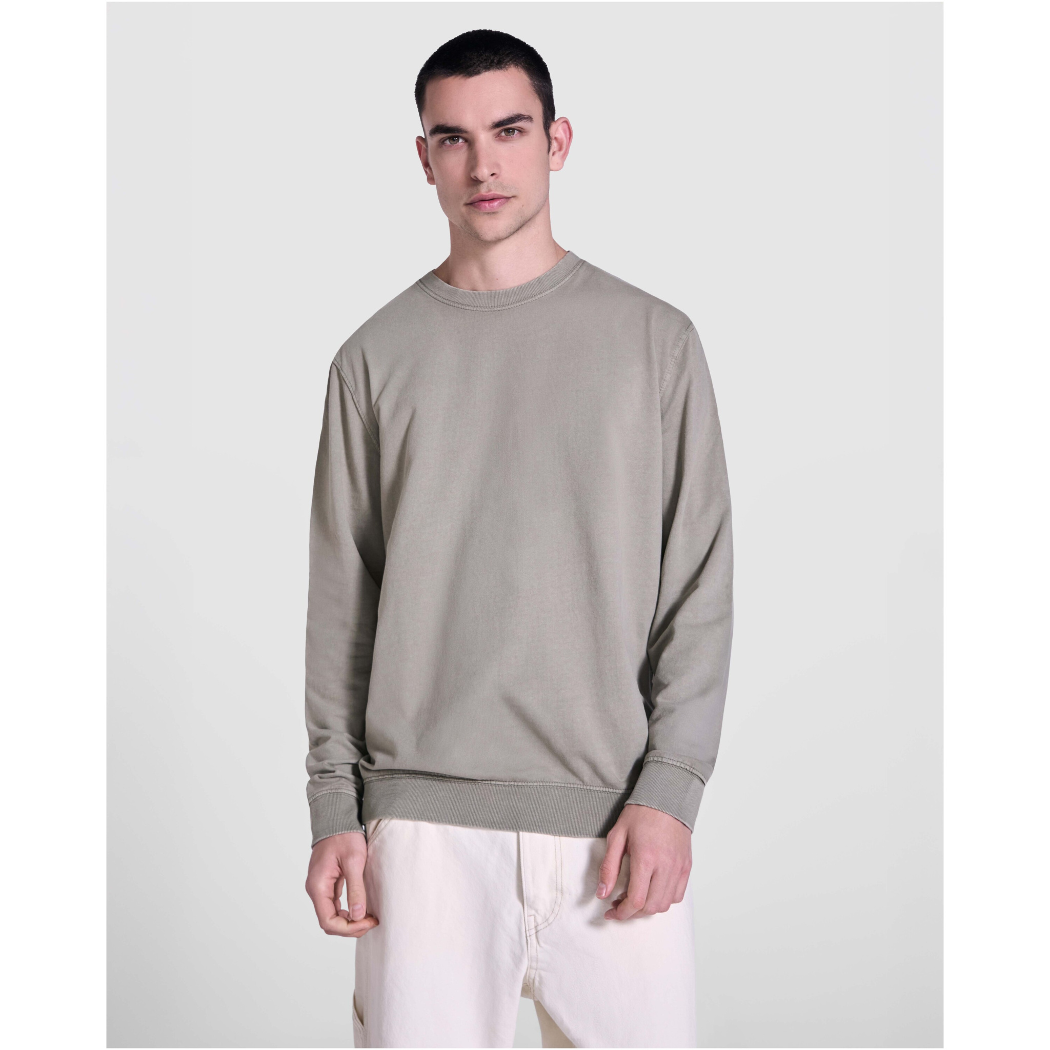 Свитер унисекс с эффектом выцветшей, потертой ткани. Воротник, манжеты и подол в рубчик 2x1 в тон. Усиленные швы на манжетах, подоле, поясе и проймах. Перекрывающий стежок тон в тон на горловине.