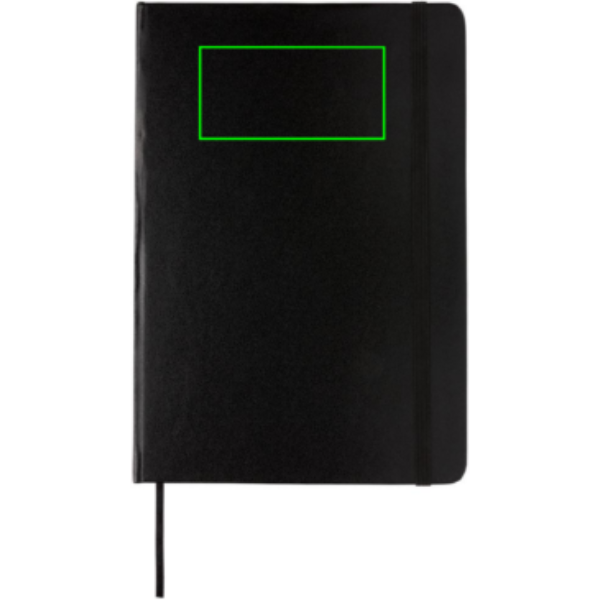 Стандартный блокнот формата А5 в твердом переплете, в линейку, с эластичной застежкой и ленточкой-закладкой. Внутри 144 страницы бумаги плотностью 70 г/м2. Страницы кремового цвета.