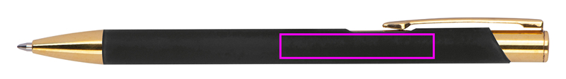Шариковая ручка из алюминия с золотыми аппликациями, резиновым покрытием и синим стержнем большой емкости. Ваш логотип будет нанесен лазером на правую сторону зажима, он будет золотистого цвета.